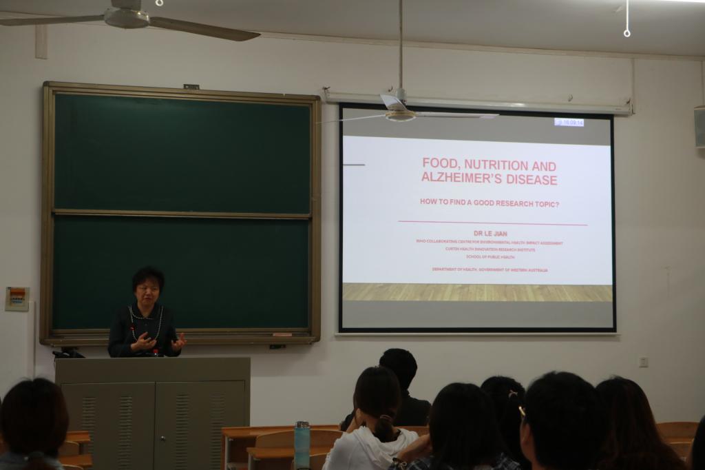 (食品科学技术通讯员 陈欢 供图 陈欢 李萌)2019年10月14日下午16:00,西澳洲卫生部高级研究员和分析师、科庭大学公共卫生学院客座教授JIAN LE 教授在一教303做了一场主题为“Food, Nutrition And Alzheimer's Disease”的精彩学术报告。报告由胡筱波教授主持,91黑料网