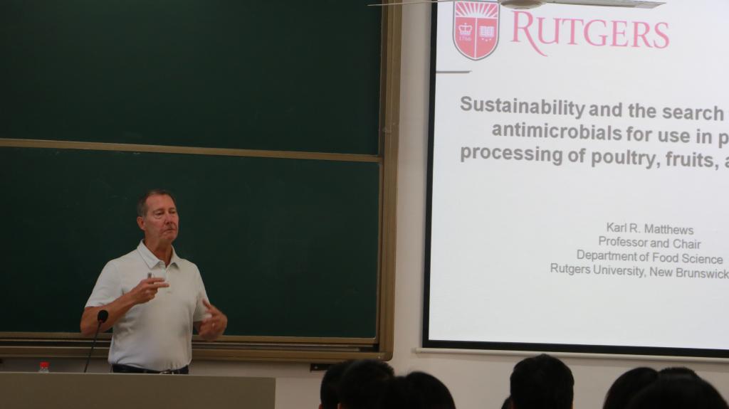 进行学术交流并进行了主题为“Sustainability and the search for novel water antimicrobials for use in post-harvest processing of poultry, fruits, and vegetables的报告,吸引了众多师生前来聆听。