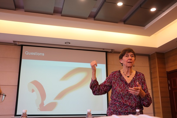 师生积极向Carrie Regenstein 女士探讨了在做陈述汇报时会遇到的诸多问题,Carrie Regenstein 女士热心地帮助几位同学解答了困惑。