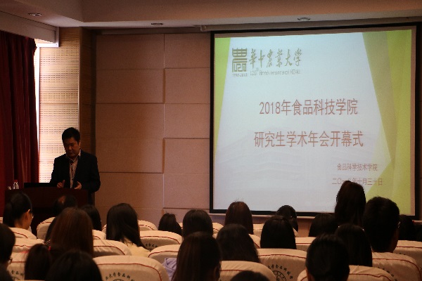(食品科技学院通讯员 许金娟 供图 周嘉欣)10月30日上午,2018年食品科技学院研究生学术年会开幕式暨特邀专家报告会在食科楼504报告厅举行,开幕式由马美湖教授主持,校党委研工部副部长涂俊才老师出席开幕式并致辞。随后,江南大学金征宇教授作为特邀专家围绕“我国食品工业发展现状、趋势与技术要求”主题作了精彩报告,吸引众多师生前来聆听。