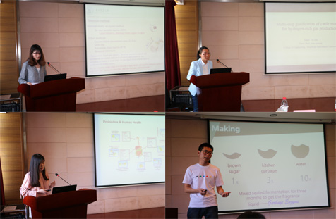 食科院的余锦露同学作为第一个汇报人,为大家带来了“CdTe/CdS量子点标记的荧光免疫层析试纸条快速检测大肠杆菌O157:H7 ”的研究,她创新性的以水相合成的具有高荧光的CdTe / CdS量子点与多克隆抗体进行共价结合,制备可快速检测大肠杆菌O157:H7的免疫荧光试纸条。随后,来自工学院的辛娅为大家带来了通过牛粪热解气化制取富氢气体的相关研究,采用分步气化的方法将牛粪转化为富氢气体,为农业生产中牛的规模化养殖业废弃物处理提供了解决方案。接着,食科院的李唯硕士、工学院的付垚硕士以流利的英语、纯正的口音为同学们带来了一场学术上的听觉盛宴。李唯硕士指出多孔再生纤维素微球可作为基底包埋吸附益生菌,并且通过与海藻酸钠凝胶的结合,可制备具有PH响应性的载菌复合微球,进而达到肠道定向释放的目的;工学院的付垚讲解了一项“利用厨余垃圾的环保酵素智能生产装备”,此装备采用自动控制原理配比环保酵素的原料质量并混合发酵、自动排气、自动记时,能够实现部分餐厨废弃的处理与回收利用。最后,食科院的张子程同学进行了主题为“紫薯花色苷有效黄嘌呤氧化酶抑制剂成分锁定及体外作用机制研究”的学术汇报,她流利的英语、精彩的演讲、大气的台风,赢得观众们的频频掌声,将本次学术会议推向了高潮。
