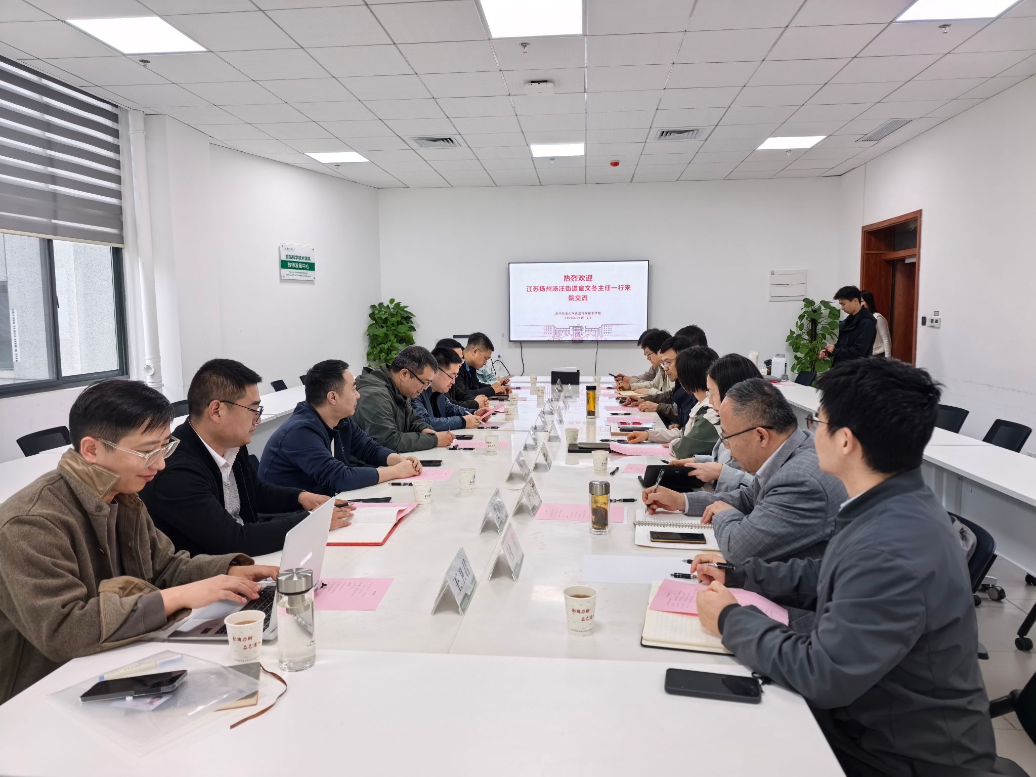 最后,双方就学生实习就业、专场招聘、技术联合攻关等达成初步共识。汤汪街道方面详细询问了学院毕业生的就业情况,并诚挚邀请学院组织学生赴扬州开展专场招聘与实地参观。宦文冬主任表示,街道的食品加工、冷链物流、工业旅游等业务板块与学院的研究方向高度吻合,期待双方建立常态化对接机制。镇志勇书记表示,学院将梳理本次对接形成的技术需求清单,鼓励学院教师团队积极推动科研成果与地方产业真正结合。他强调,校地合作不是“一阵风”,而是要通过一个个具体项目、一次次人才互动,实现双向赋能、长期共赢。