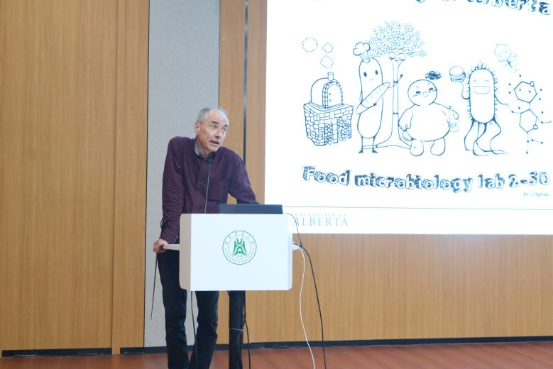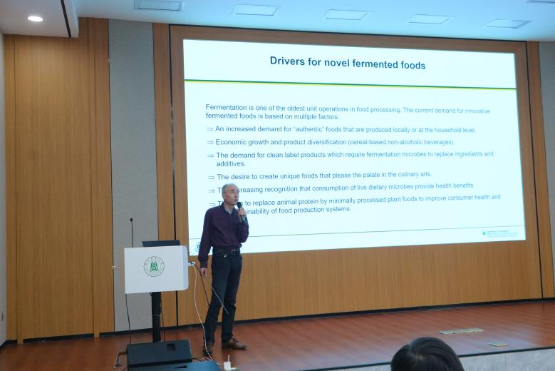 103会议室进行关于食品创新发酵的学术报告。Michael Ganzle,加拿大阿尔伯塔大学教授,加拿大食品微生物与益生菌研究主席(Tier1),加拿大皇家科学院院士,国际权威的食品微生物和益生菌专家。Michael Ganzle教授长期致力于乳酸菌的功能特性与新型非热食品保藏方法研究,以开发新型食品发酵剂、保护剂、益生菌等。