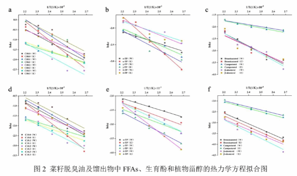 针对乙醇蒸汽脱臭作用机制不明确的问题,该研究聚焦于菜籽脱臭油馏出物动力学方程模型及参数(qe)(表 1)和热力学方程模型(图 2)及参数(∆G0、∆H0 和∆S0)(表 2),探究乙醇蒸汽夹带机制。与水蒸汽蒸馏脱臭相比,低温乙醇蒸汽脱臭的额外效果源于乙醇的较高蒸汽压及乙醇蒸汽与游离脂肪酸、生育酚和植物甾醇之间的分子间作用力(包括氢键、色散力和诱导力)。