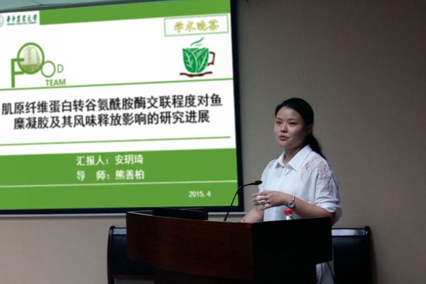 熊善柏教授团队的13级研究生安玥琦作了题为“肌原纤维蛋白转谷氨酰胺酶交联程度对鱼糜凝胶及风味释放影响的研究进展”的报告。本次学术晚茶由食科院研究生会主席陈梁主持,众多同学参与学习和讨论。安玥琦同学主要就其领域的国内外研究成果及个人研究进展进行报告,到场同学认真聆听,晚茶气氛轻松。