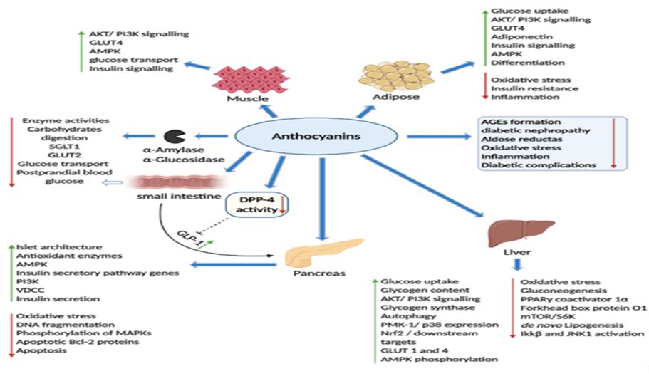 图2高尿酸血症与高血糖的联系,花色苷的降尿酸作用及其对代谢综合征的潜在调节作用