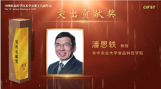 潘思轶教授获得突出贡献奖,大会对他的颁奖词是:“荆楚大地食品科技界的领军人”。