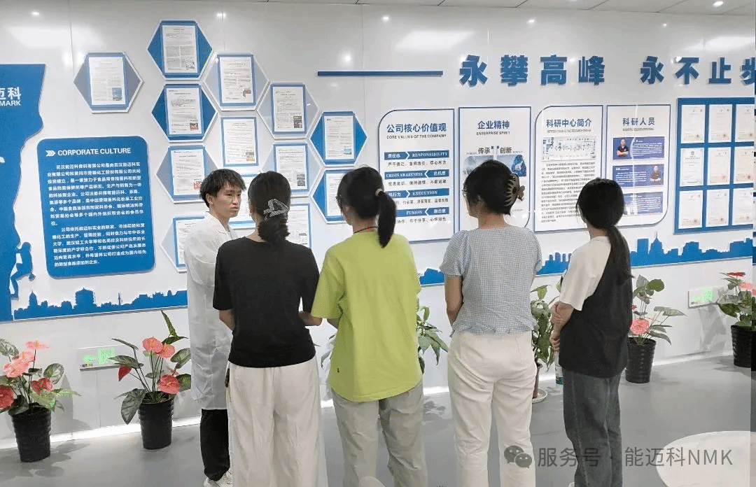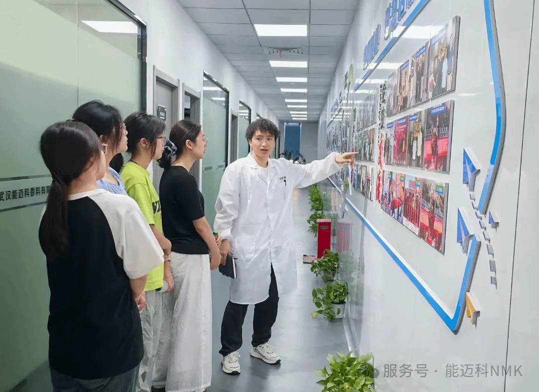 在能迈科研发主管的引导下,师生们首先参观了企业成果文化墙。墙上陈列着公司从创立至今的重要发展节点:一张张照片、一份份证书,记录了企业深耕食品添加剂及香精香料领域十余年的坚持与创新。通过研发主管对具体案例的讲解,师生们了解了能迈科在技术研发和市场应用中的实践经验。