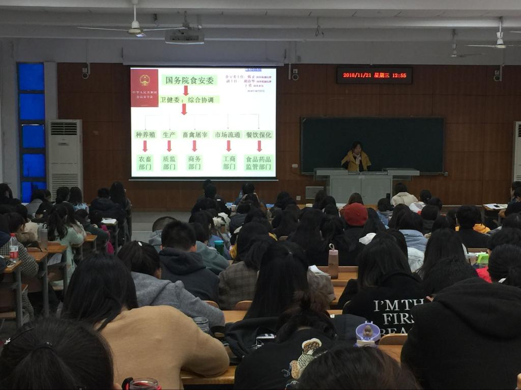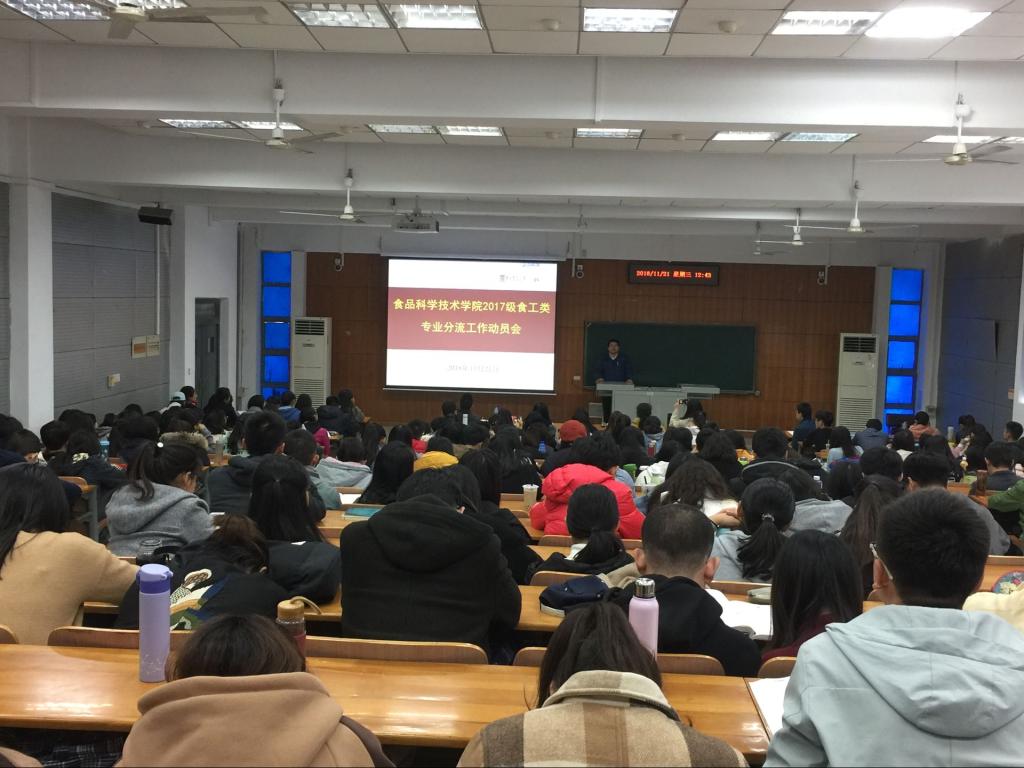 在三教A105教室召开2017级食工类专业分流工作动员会,学院副院长张柱红、副书记向异之、食品科学与工程专业负责人熊善柏教授、食品质量与安全专业负责人郭爱玲教授及学院全体2017级本科生参会,会议由2017级辅导员胡小娱主持。