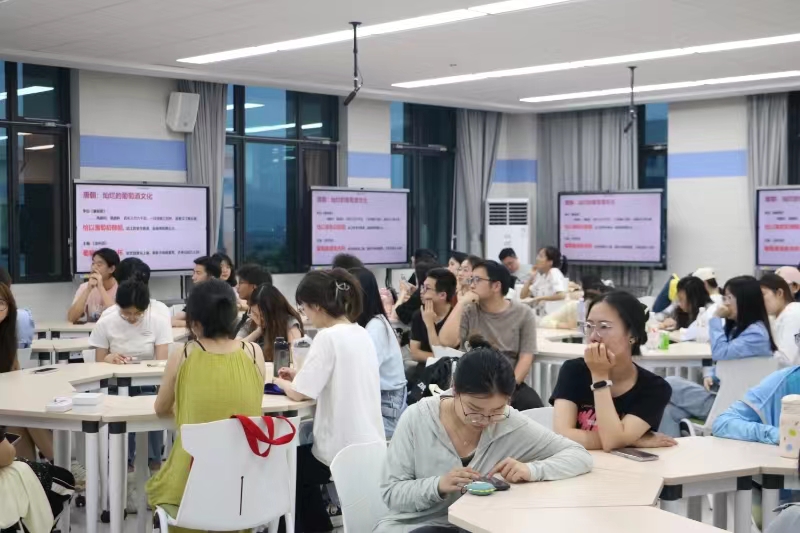 在品鉴环节,李二虎教授亲自示范了开酒和倒酒的标准流程,并鼓励学生们亲自体验。伴着甘醇的酒香,师生们一起品鉴了一款贵人香白葡萄酒,领略了葡萄酒所表现出的“清新雅致、平衡爽净、细腻柔顺、馥郁悠长”特征。
