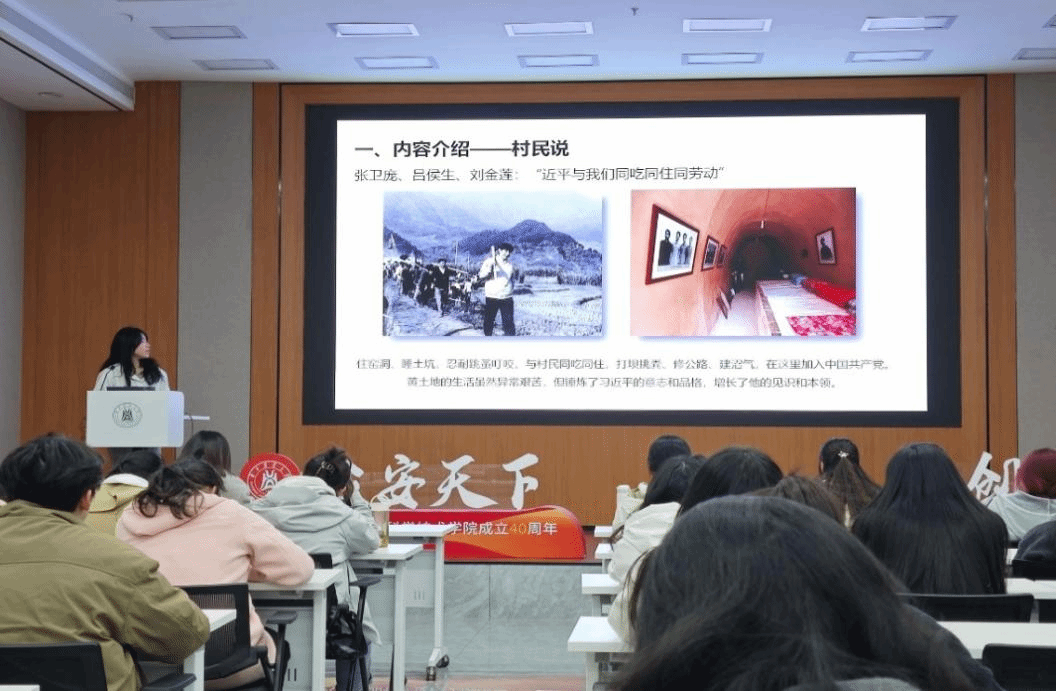 在分享环节,李蔚青同学分享了《习近平的七年知青岁月》的思想内涵。李蔚青同学表示,习近平总书记的故事让她深刻理解了“人民公仆”的真正含义,也激励她在今后的学习和工作中,更加坚定地为人民服务。她的分享生动有趣,为在场的同学提供了有益的思考与借鉴。