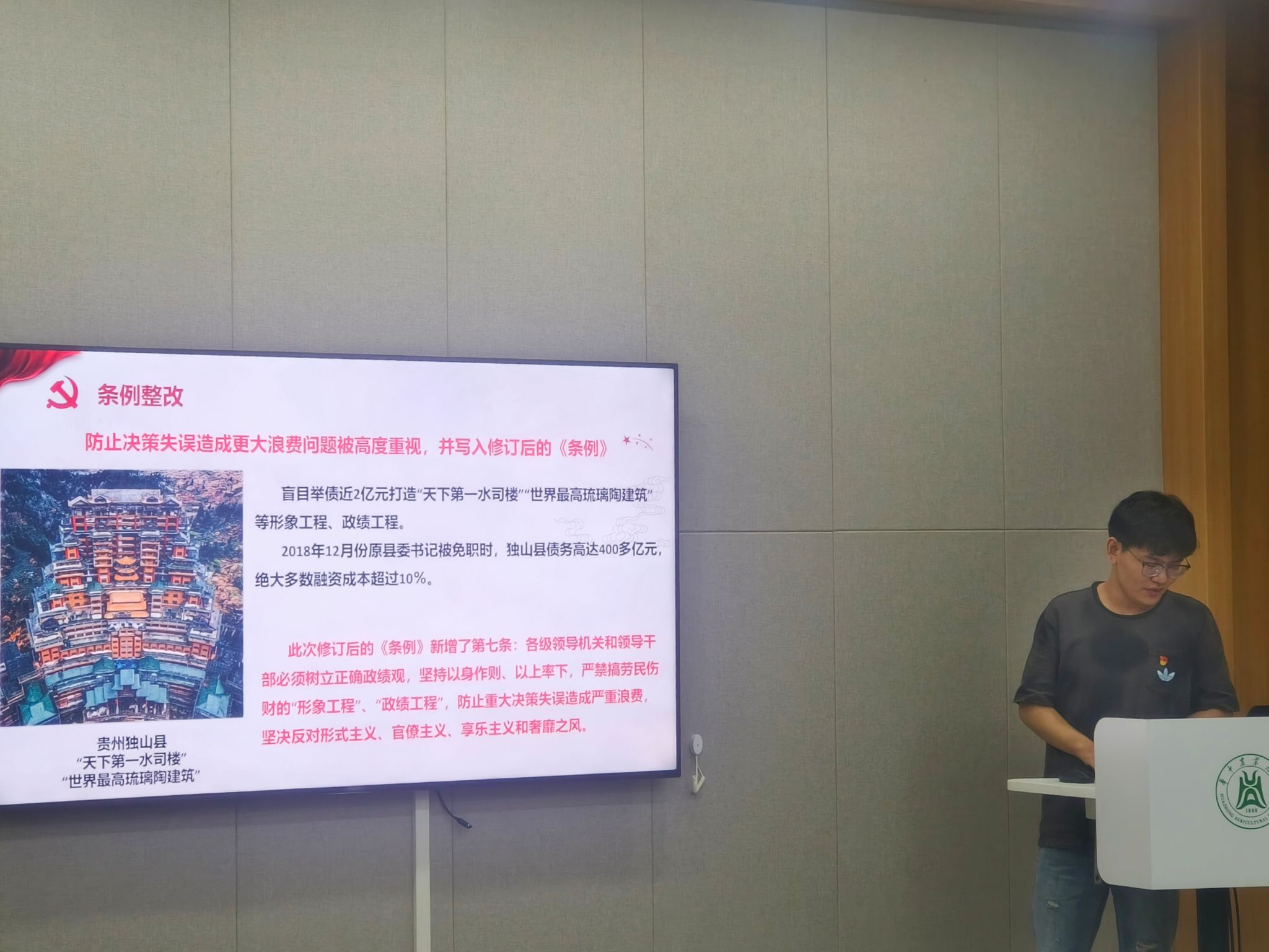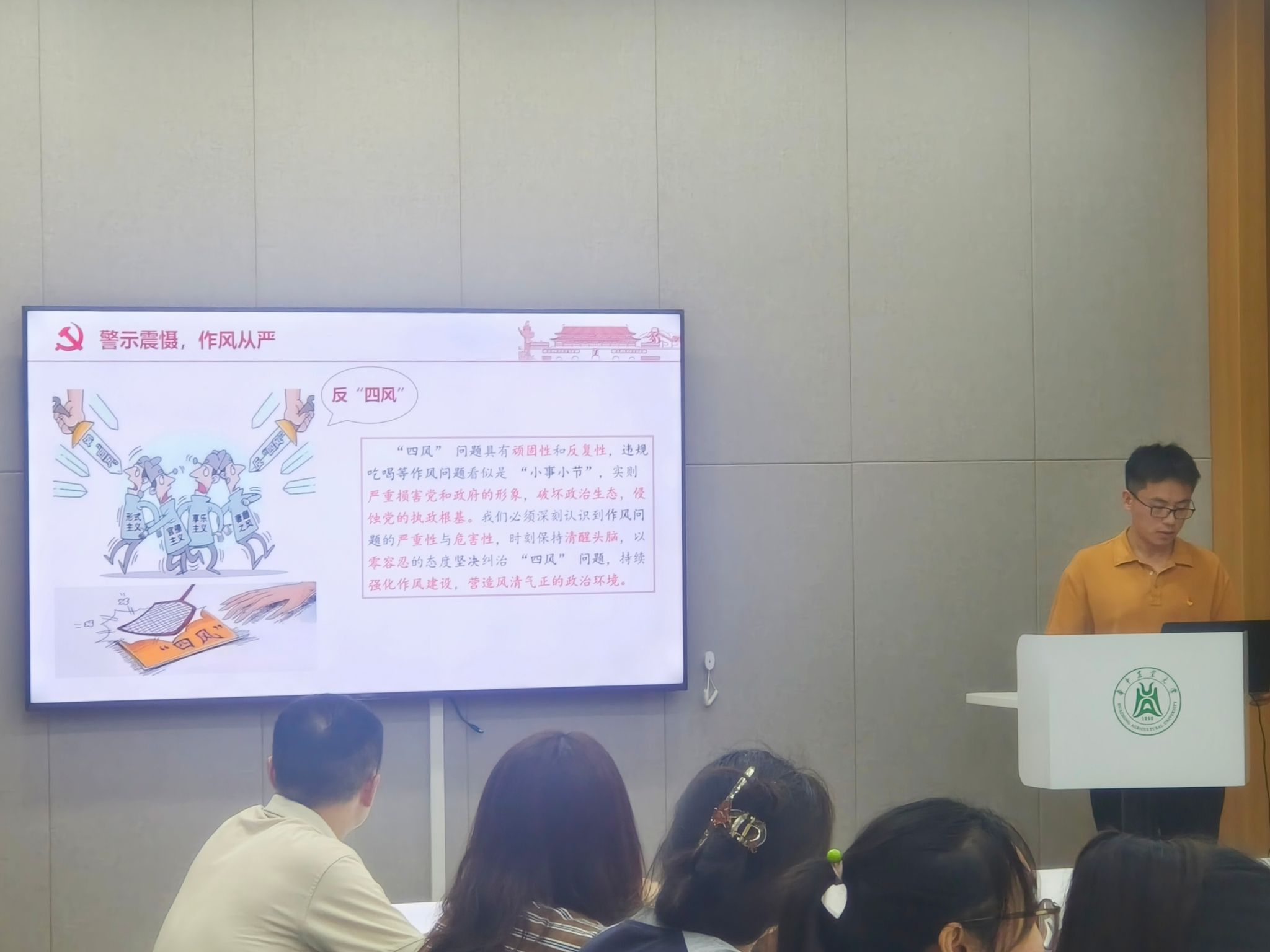 此外,支部运用中央层面和学校相关典型问题案例开展警示教育,通报河北省三河市在城市管理中违反中央八项规定精神、侵害群众利益问题,湖北省黄冈市黄梅县有关党员干部违规吃喝问题等典型案例。以案为鉴明纪,强化作风整治。全体党员应时刻保持清醒头脑,自觉抵制各种诱惑,做到心有所畏、言有所戒、行有所止。