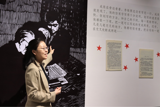 “1948年,解放战争正以雷霆万钧之势向前推进,反革命的最后堡垒重庆正处于全面包围之中,盘踞在这里的国民党反动派进行着垂死的挣扎,而被关押在‘中美合作所’集中营里的许云峰、江姐等共产党人,则同他们展开了一场胜利前光明与黑暗的殊死搏斗。”学院团委书记、辅导员胡小娱担任本次参观的导览,向同学们讲述着一幅幅版画背后那难忘的动人故事与红色精神。