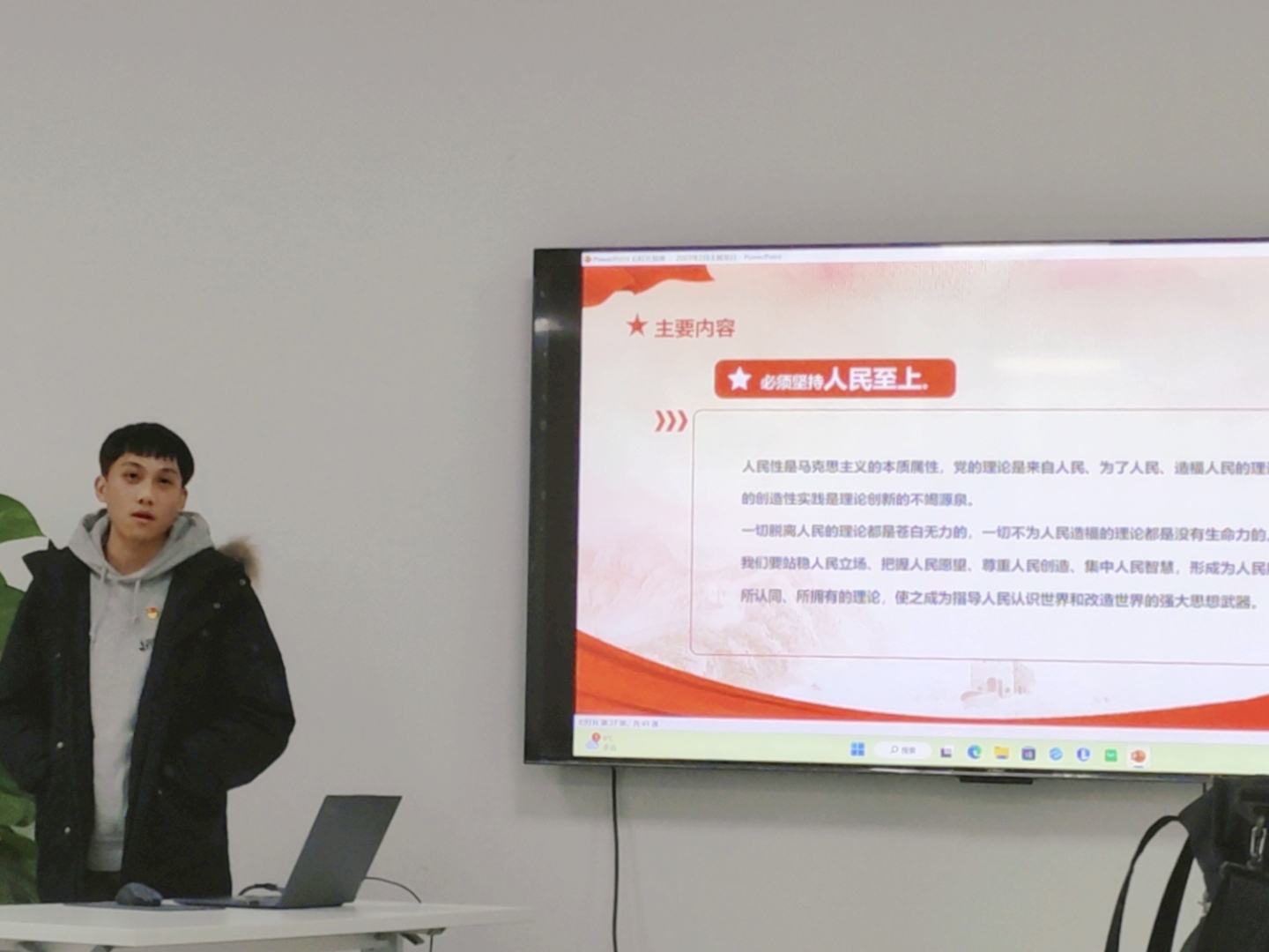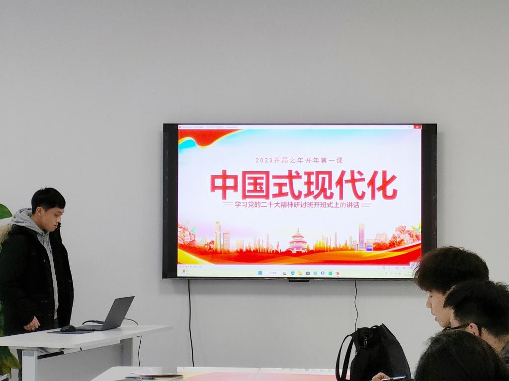 研究生第七党支部开展二月主题党日活动,共同学习习近平主席在学习贯彻党的二十大精神研讨班开班式上的重要讲话,并以此为基,更加深入地学习中国式现代化的本质特征以及“坚持人民至上”的理念。会议在工科楼120会议室进行,由研究生第七党支部书记丁一峰主持。
