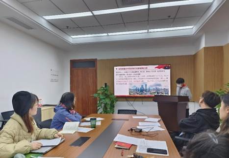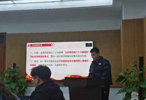 会议第一项:开展以“学习贯彻党的二十大精神”为主题的党日活动。第一环节,以现场答题方式对党支部党员同志进行了党的相关知识考查,同志们认真迅速地完成了考查内容。第二环节,第五党小组分别从学习中共中央、国务院公开发布的《关于做好2023年全面推进乡村振兴重点工作的意见》、深入学习《教育系统关于新时代学习弘扬雷锋精神 深入开展学雷锋活动的实施方案》、学习回顾从党的二十大到2023年全国两会、深入学习贯彻党的二十大精神专题宣讲报告会四个方面进行了PPT汇报及相关视频分享。第五小组成员勉励支部党员同志们要认真学习宣传贯彻党的二十大精神,以昂扬向上的精神状态和锐意进取的学习热情,把党的二十大精神转化落实到学习工作中去,要做最活跃、最富创造力、最具激情的新时代研究生。