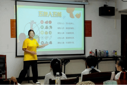 在三潭社区,第一分队以“舌尖上的彩虹梦”为主题开展教学。主讲人食工2302班宋婧楠同学巧妙地将中医“五色入五脏”理论与现代营养学知识相融合,用红、绿、黄、白、黑五种颜色对应人体五脏心、肝、脾、肺、肾,生动阐释了不同颜色食物的健康功效。