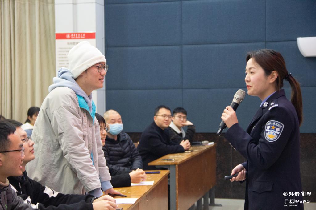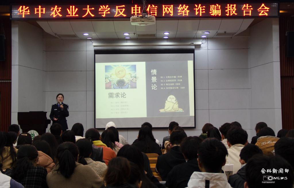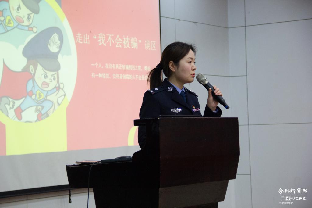 校内直播方式进行线上同步传播。报告会邀请了洪山区公安分局警官张钰菡为师生讲述校园防骗知识。