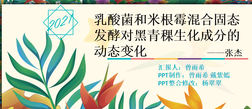 杨翠翠代表第三组分享了《乳酸菌和米根霉混合固态发酵对黑青稞生化成分的动态变化》这一文献的学习成果。周贝针对其PPT内容及讲解表现指出,结果呈现的图表里没有对单独发酵和混合发酵的结果进行显著性分析,这块内容有待改进;高霞也表示,该组呈现的风格比较活泼,略缺少一些文献学习应有的学术与严谨。