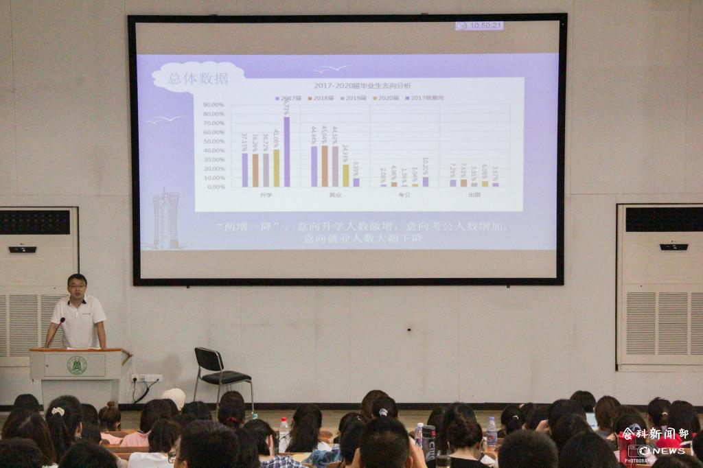 2017至2020年的数据,他向大家总结了近年来毕业生去向“两增一降”的趋势——意向升学人数激增、意向考公人数增加、意向就业人数大幅度下降,并从“升学”“考公务员”“就业”等四个大类进行了详尽的讲解与分析。