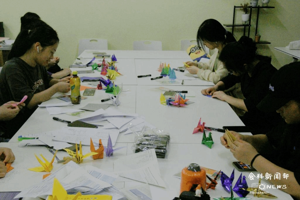 “青年志愿者协会”与“食科一家人”基金会共同举办的“变纸为鹤,只只纸鹤含深情”的折纸送祝福活动在食科党员活动室开展。