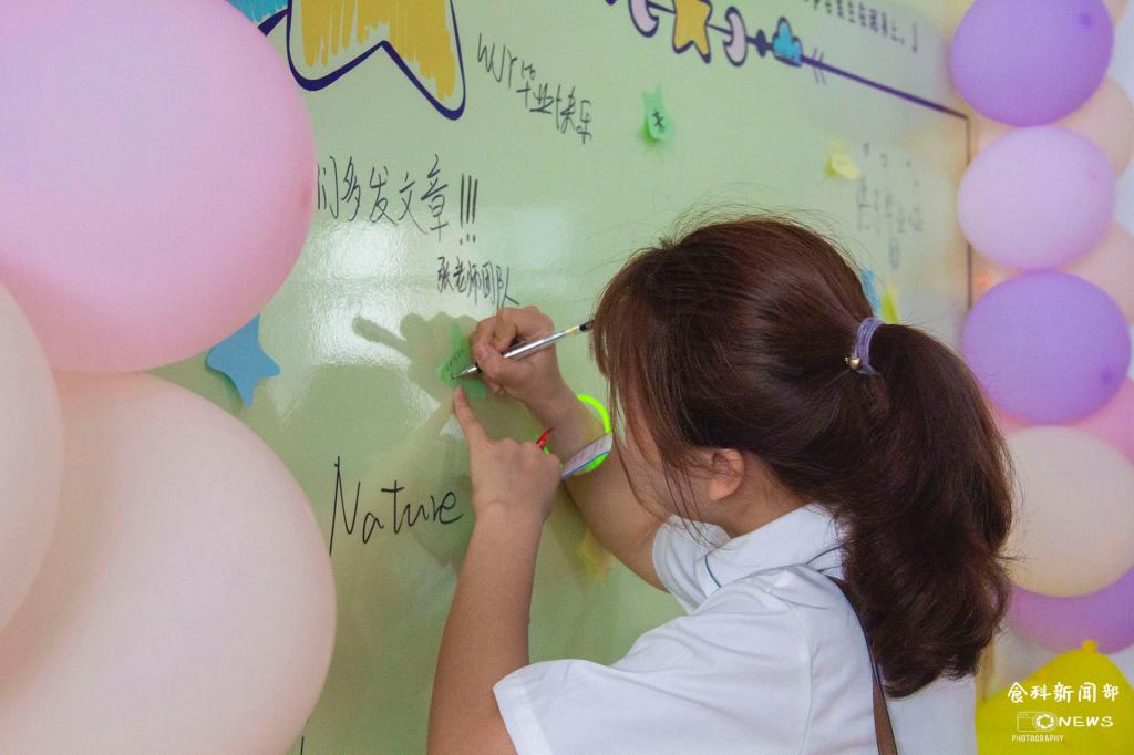 走过零食区,抬起头便能看到绿色区的回忆墙。绿色代表“绿水长流”,毕业的脚步催着离别的花开,友情的列车永远没有终点。在这里,记忆的书页被一张张明信片、学习笔记、奖状打开,细细翻阅,往昔一幕幕浮现。一旁寓意着“飞黄腾达”的黄色区里有着一面祝福墙,上面许许多多的星星便签与纸条正承载着大家的美好祝愿飞向全新的未来。