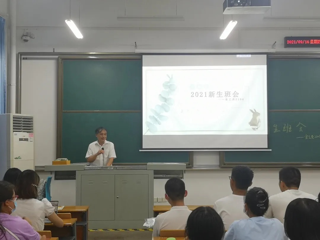 21级新生班会在工科大楼及四教召开,学院学院领导老师走访新生班会现场,为同学们送去新学期的嘱托。食工类2101班新生班会在工科大楼122召开。学院院长徐晓云、党委副书记向异之、学生事务中心主任申沛、加多宝集团党委书记庞振国、班主任盛龙参加会议。
