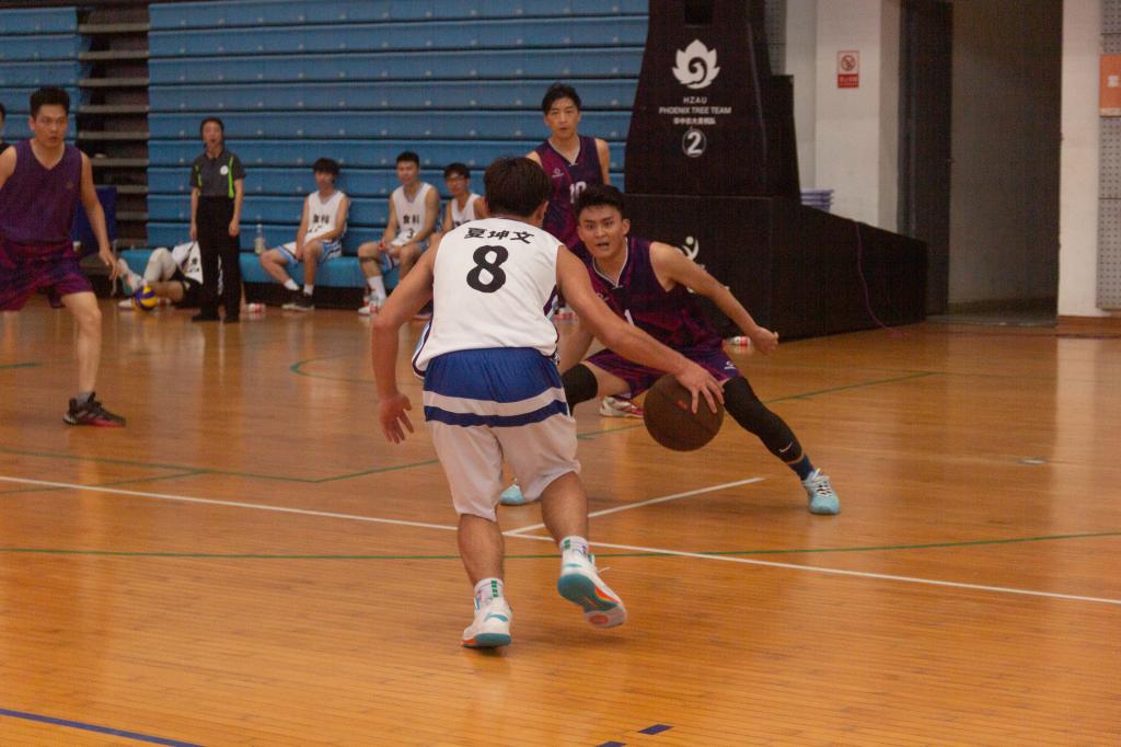 比赛持续火热进行,毕业生同学们也不甘示弱。毕业生队8号球员夏坤文抢断过后只身运球过半场,被身后的对手拦截又奋起直追,再次抢断并发起快攻,将球稳稳送入篮筐。