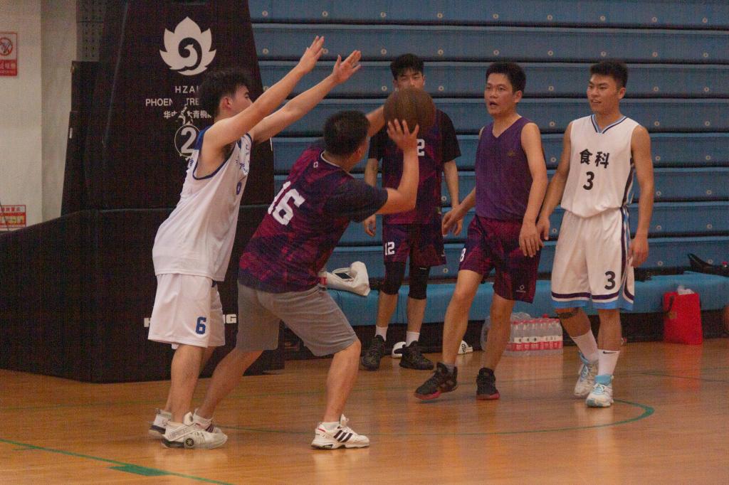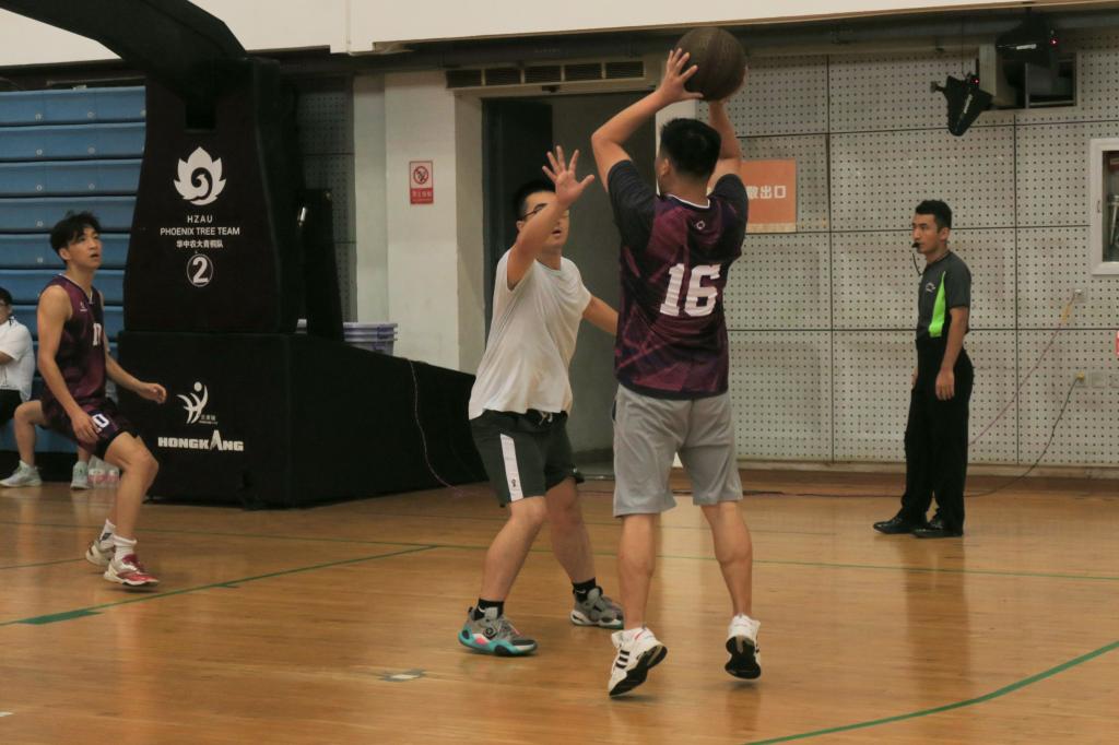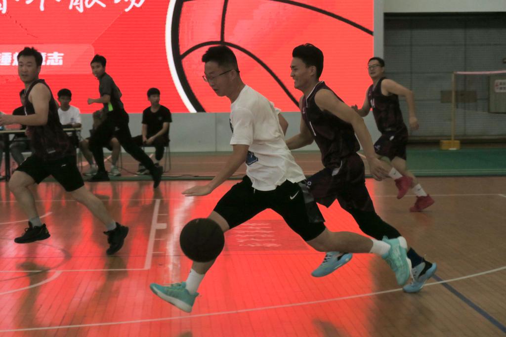 比赛过半,紫队18号球员陈翊平第二次罚球未中之后,从罚球线起跳争抢篮板,拿到球权后与防守队员进行身体对抗,最后在篮筐下终结打板进球。双方队员你来我往,平日并肩努力的同学和一起工作的同事,此刻都是一起挥洒汗水的队友,对篮球的热爱都在此刻绽放。
