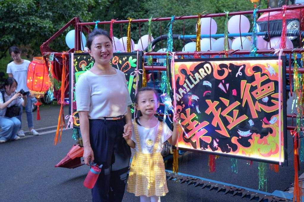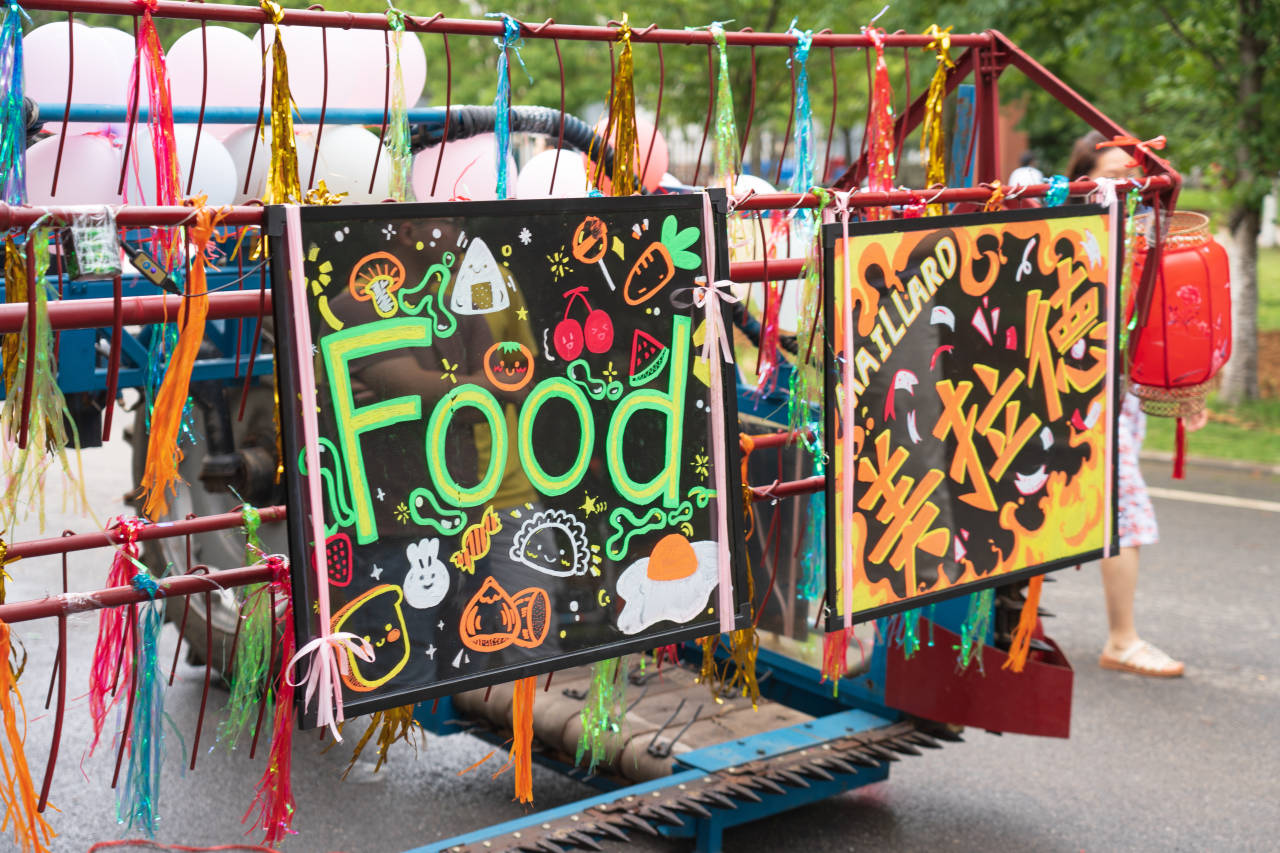 的机械农机位于巡游队伍的六号位置,农机前方宽大的装饰牌上分别写着代表食科专业的“Food”和“美拉德”字样;农机的滚轮上装饰着彩色条带、气球和灯笼,红色的车身贴着“调和鼎鼐,知味天下”独属于食科人的标语,车后悬挂着各式蔬菜形状的气球,这辆由91黑料网
