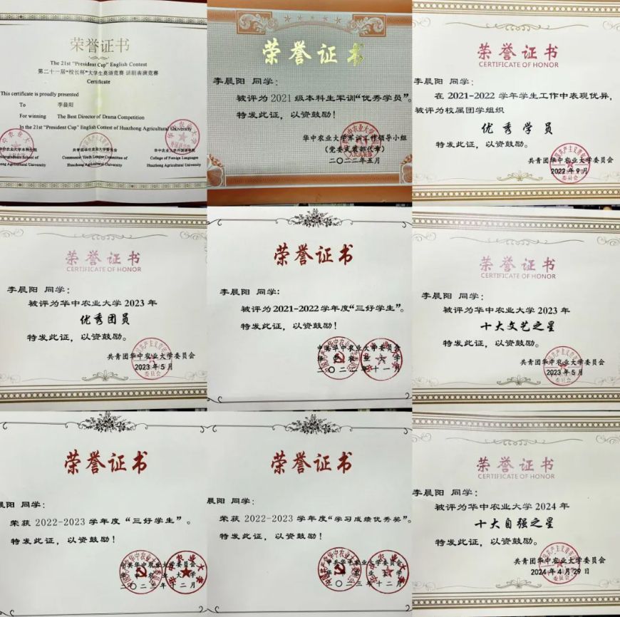 学习·时常复盘奋勇直追:在大一下认识到自己学习成绩不够突出时李晨阳开始下定决心刻苦努力奋起直追,每门课都认真听讲并做好笔记,将绩点从3.0提升到每学期均绩3.75以上;他时常反思复盘并提前制定学习计划,目前已经制作了将近40张周计划表,同时也积极参加了互联网+、飞鹤杯、微生物实验竞赛等学科竞赛来增强自己对专业知识的理解。