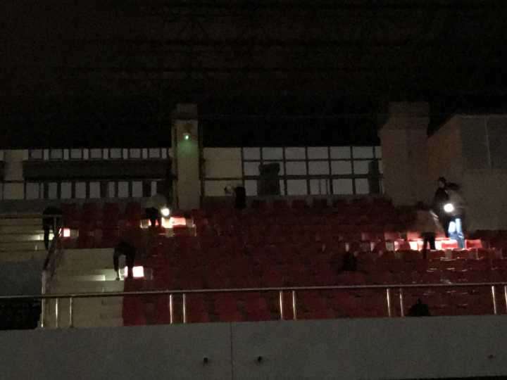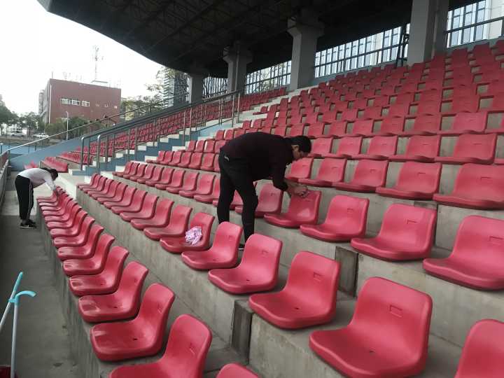 女生部部长周璐瑶和党建主任程晓磊带领两个部门所有副部到二运为明天的校运动会提前打扫观众席。从夕阳西下一直到月至斗牛,此次活动一共持续了3小时。