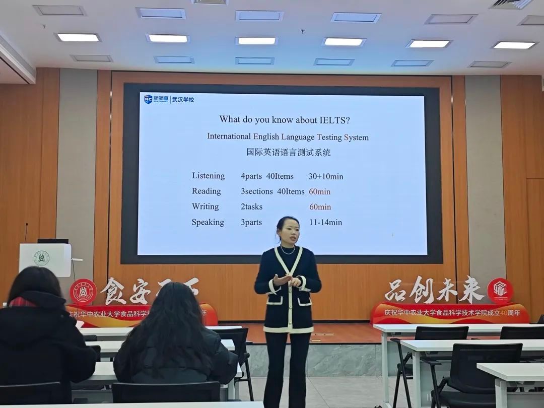 特邀新航道前程留学研究生部总监杨涛、新航道武汉学校雅思项目一部总监张晓丽两位资深专家,在食科院楼103会议室举办了一场“雅思&留学”规划指导讲座,讲座吸引了众多有留学意向的同学参与,现场气氛热烈。