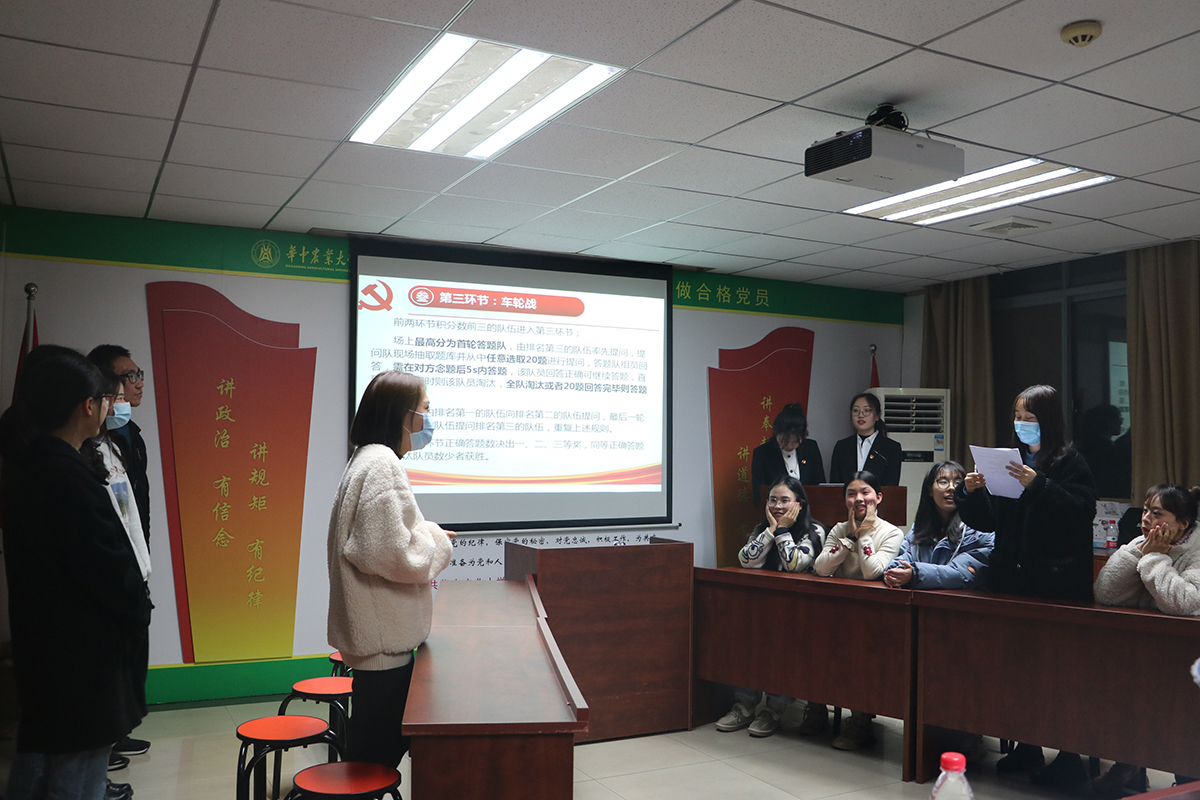 “和平和发展是当今世界的主题”、“解放思想、实事求是、与时俱进,是马克思主义的精髓……”。对于个人必答题的基础问答环节,12组选手纷纷亮相,积极回答,展现出丰富的党史知识储备。随后,在抢答赛环节中,各队选手们展开了激烈的角逐,各参赛团队反应迅速,难分伯仲,“抢答题不光要求同学们记得题目的答案,还要能够几乎没有反应时间的情况下精准的说出问题的答案,给党员同学对于理论知识的熟悉程度提出了很高的要求”,辅导员张静妍在比赛的过程中感叹道。最后场上得分最高的三组同学进入第三环节车轮战,展开最后的巅峰对决,三队之间互相提问20题,被提问方队员逐个答题,当答题错误或者超时则该队员淘汰,全队淘汰或20题全部回答完毕则答题终止,选手们沉着冷静,思路清晰,自信应对,充分运用丰富的知识储备来进行精彩作答,“党员要发挥社会主义新风尚,带头实践社会主义核心价值观和社会主义荣辱观,提倡共产主义道德,弘扬中华民族传统美德”……比赛有声有色地进行着,最后根正苗红队获得一等奖,游击队获得二等奖,新时代青年队获得了三等奖。