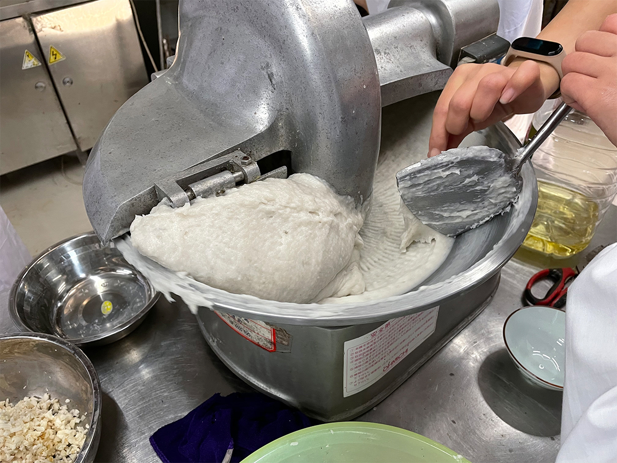 原料准备就绪,紧接着进入工艺中最关键的一步:鱼糜的制作。这一步中需要将新鲜鱼糜、新鲜的猪肥膘、蛋清、TG酶荸荠及姜水混合搅拌。伴随着各种原料之间的搅拌,鱼糜似乎发生了奇妙的化学反应,逐渐形成具有黏性的鱼团,糅和后鱼丸料,呈糊状但韧性十足。“为什么鱼丸中会有猪肉膘和蛋清呢?”、“加入TG酶的作用是什么呢?”同学们在实践的过程中不断发出了疑问并提出了自己的猜想。“肥膘肉和蛋清有乳化作用,加入猪肉也为了口感更好。鱼丸的蛋白质含量高,加TG酶可以使蛋白质的交联更好,这样做出来的鱼丸口感会更Q弹。”