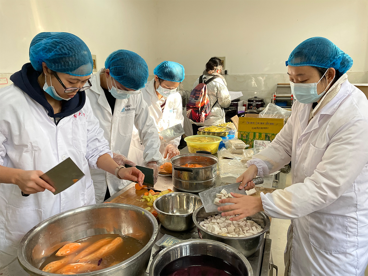 “天哪!鱼丸竟然需要十几种原料!”只见同学们将紫薯、土豆、芋头、姜和荸荠一一削皮并切片备用,一盆盆食材、一份份调料,伴随着同学们越来越熟练的刀法,在实验室冬日的暖阳中映在了同学们红润的笑脸上。