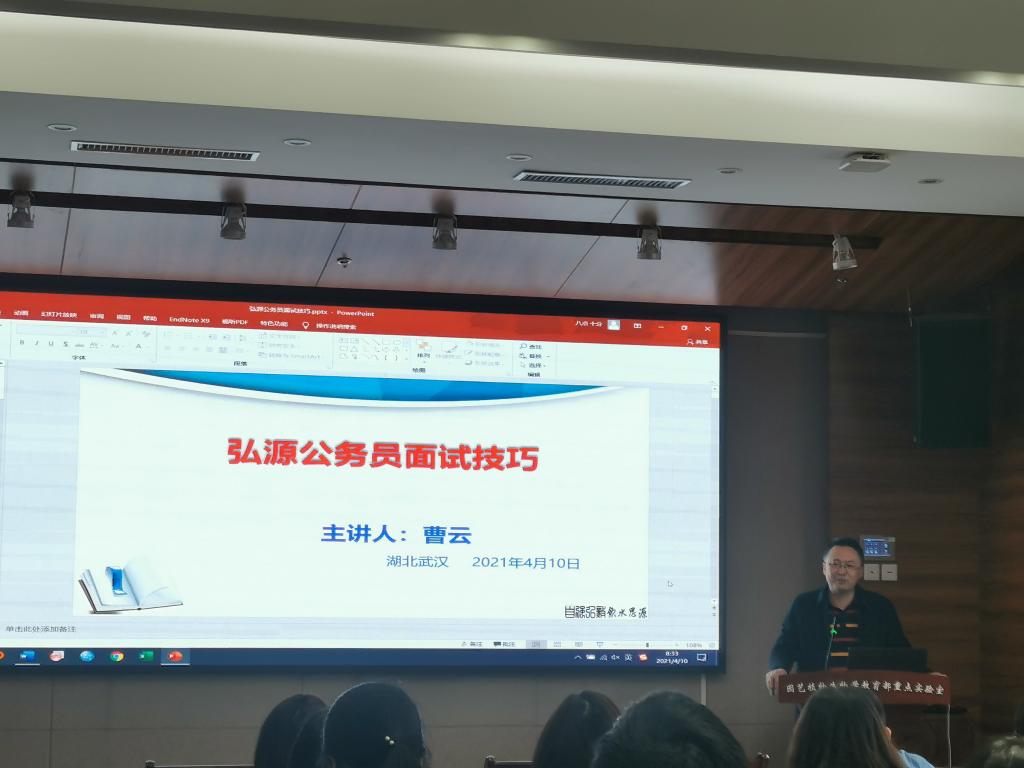 讲座开始,曹云师兄开门见山,讲述了在公务员面试中最重要的一点。“公务员面试最重要的是把自己从中学以来的学习、生活、工作以及社会实践知识进行系统的回顾、归纳、总结和提升,并按照一定的技巧表达出来,对于自己表达的事情,一定要学会自圆其说!”