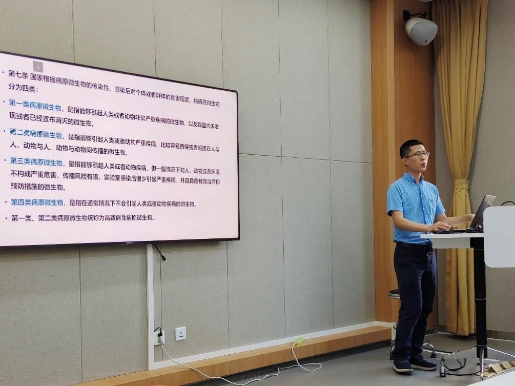 动物生物安全三级实验室安全负责人陈西博士为师生作了“病原微生物实验室生物安全培训”的培训。培训以线下结合线上的方式,学院涉及到病原微生物实验室管理与使用的师生和生科、动科、植科、水产、资环等学院的老师60余人参与了培训。