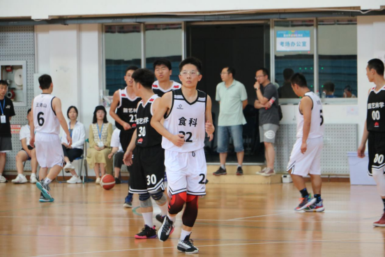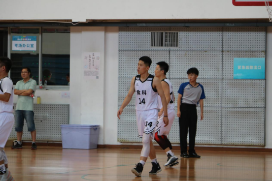 随着裁判的一声哨响,比赛开始,身穿白色队服的食科队员积极跑位,相互配合,10号球员陈众手感火热,连进三分,14号范贺凯化身“篮板守卫者”,为队伍抢下数个关键篮板,22号张墨与13号肖睿恒进攻流畅,接连跳投得分。随着比赛进入到下半场,气氛逐渐紧张,球员屡屡碰撞,对方球员利用我方防守失误连续快攻,我方球员也认真总结比赛经验,加强防守,但由于体能不足,队员们的脚步逐渐沉重,最终不敌工学院、园林学院。