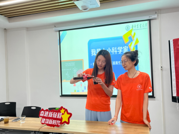 图为志愿者进行科学小实验。
