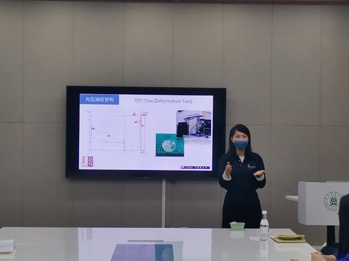 随后,屈良静工程师针对实验数据与感官结合进行了讲解。她介绍了质构仪常见参数的意义,如何选择合适的探头高效的完成实验,避免边缘效应对实验数据的影响。同时,她特地带了三种软糖让同学们品尝,现场提问这三种软糖在口感和质地上的区别,同学们踊跃发言。屈工还为同学们介绍了Q与弹的区别,其中Q是一个三维变量,压缩之后X轴也存在一定的扩张,而弹则是一个二维变量,表现为压缩回弹现象,进而引出此次课程的重点内容即实验数据与感官结合。