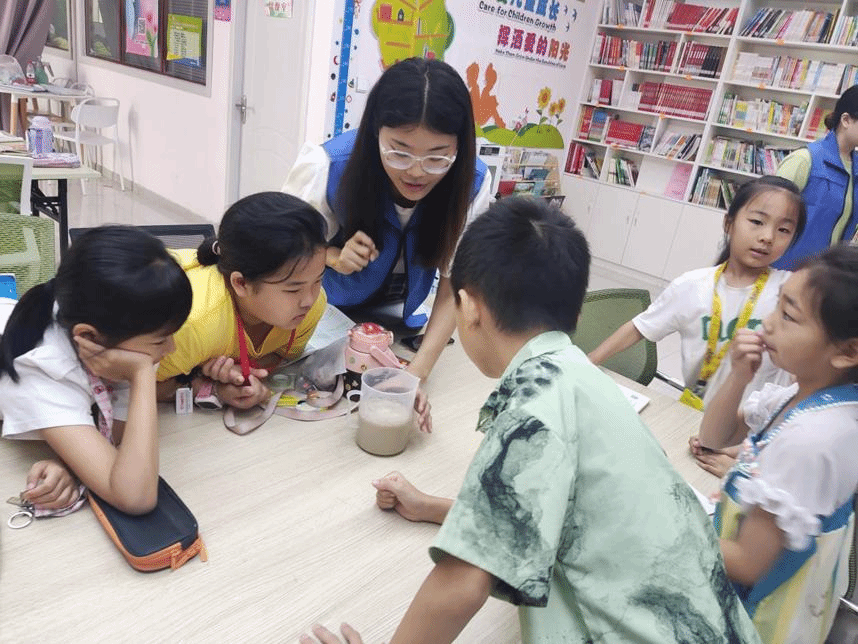 志愿者裴丽娜在和小朋友们一起做实验-奚俊