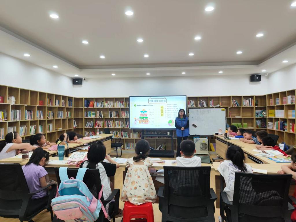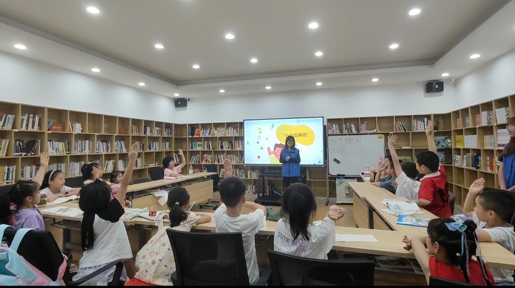 活动现场,博士科普团的志愿者首先向孩子们科普了“五大营养素”和“膳食平衡原则”,她问道:“有没有小朋友知道什么是五大营养素呢。”孩子们争先恐后地回答:“蛋白质,脂肪!”一个小朋友补充道:“还有维生素和矿物质。”志愿者说到:“还有我们的大米饭中富含丰富的什么呢。”“老师,我知道,是碳水化合物。”一个小朋友抢答道。随后,志愿者围绕“夏季应该吃什么?”这个问题与现场的同学们进行交流互动。通过交流互动发现,隔夜西瓜、雪糕、冰荔枝、凉菜成为炎炎夏日许多儿童家中的必备“解暑“食品。对此,志愿者给小朋友和家长提供了合理健康的饮食建议:“夏天应该多吃粥、寿司等富含碳水化合物的食品补充能量,还有西瓜、草莓等新鲜水果来补充维生素,还要多喝奶昔、果汁和水。但是小朋友们要注意凉性水果和高糖高脂高盐食品能不能多吃呢?”小朋友们异口同声:“不能!”之后同学们学习了夏季饮食“5要5不要”、夏季饮食“六”原则和一些生活小技巧。最后在“小小营养师”的问答活动中,志愿者请到了两位小朋友展开了答题活动,现场气氛十分活跃。