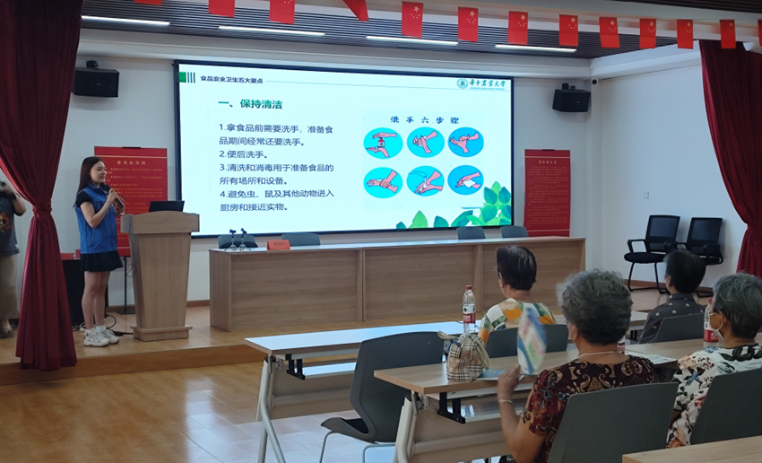 “食品安全与营养”武汉行博士服务团走进武汉市洪山区农科院社区,开展了以“关心食品安全”为主题的食品安全与营养科普知识讲座,向社区的居民介绍了食品安全卫生五大要点、食品安全卫生四大杀手、预防食物中毒以及食品卫生安全七要素等内容。本次活动由博士团胡雪芹担任主讲人,农科院社区居民以及工作人员等40余人参与此次活动。
