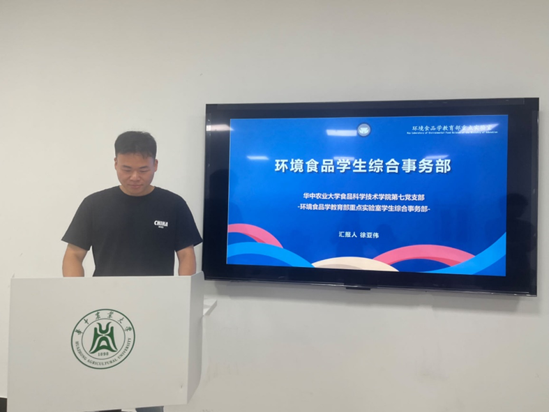 学生组织体系的介绍,首先由党建办主任宋咏恬向大家介绍食科院党建办具体情况。学院研究生党建办公室是在学院党委指导下和研究生辅导员领导下的协调办事学生组织,是学院党委和各培养层次研究生党支部之间沟通的桥梁和纽带。每月常规工作有党日活动的通知、流动走进每个支部的党日活动并进行学习、党日活动材料的收集和整理等。除此之外,还介绍了特色活动概况。研究生会主席方悦霓介绍研究生会的具体情况,学院研究生会以服务广大研究生为宗旨,坚持以爱国成才引导同学、以切实行动代表同学、以全心全意服务同学、以丰富活动发展同学,充分发挥研究生会"学生之家、师生之桥、干部之校"的作用。最后,环境食品学生综合事务部徐亚伟介绍事务部的具体情况,该部门2018年入选首批高校“百个研究生样板党支部”创建名单,作为首批全国党建工作示范高校、标杆院系、样板支部,一直坚持发挥党支部的主体作用,充分发挥食品专业特长,逐渐形成了支部独特的“食研文化”,旨在培养出一批又一批“理想信念坚定,学业成绩优异,带头作用凸显,师生高度认可"的研究生党员。