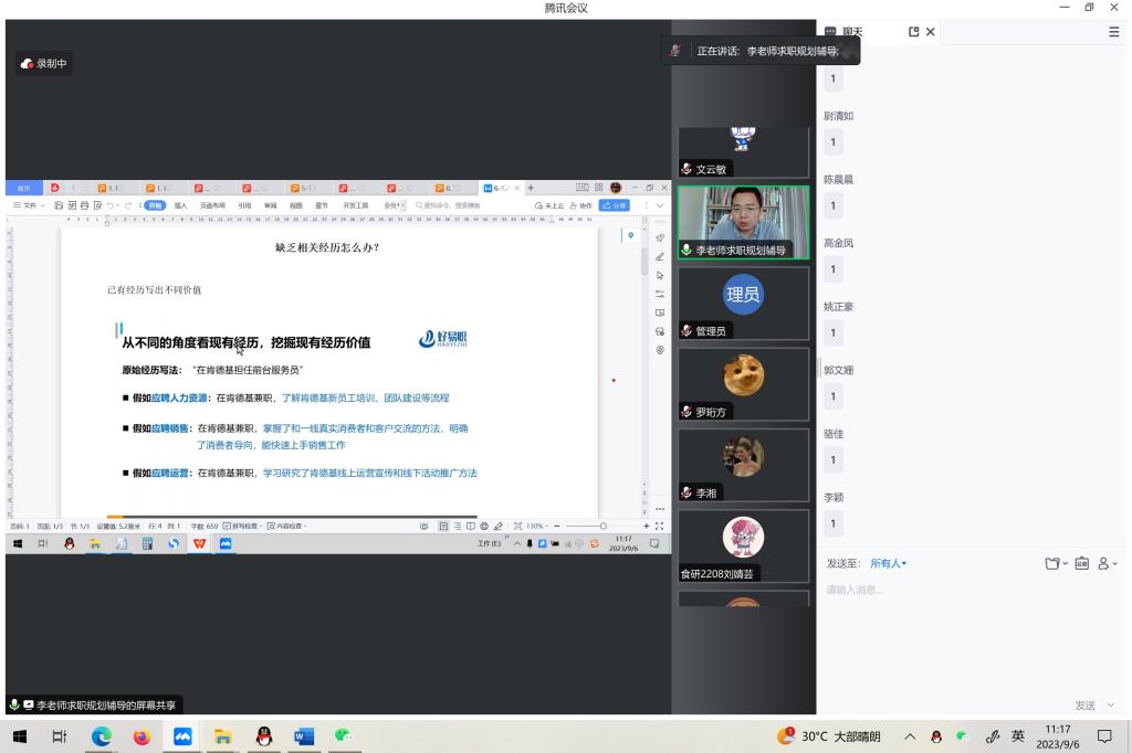 李健华老师就同学们最关注的简历撰写为主线进行展开讲解,简历中的每个部分都举出了大量的例子,让同学们更加深切的了解到面试官的想法,进而更好的拿到自己想要的offer。首先,李老师就简历排版问题入手,指出了大多数学生的简历通病 ——“模板化“,希望同学们能够通过学习,摒弃”电脑生成“,写出一份属于自己的简历。李老师先后通过如何在简历中提炼整理有效信息,如何挖掘现有的经历价值、缺乏相关经历情况下要怎么办等问题,结合丰富的案例,让同学们学会如何更好的制作简历。”对照岗位要求,以岗位为中心,写出对岗位的价值“,不只简单描述实习经历,另外对于毕业生找工作时,应当“知己知彼,百战不殆”,如何快速了解企业和岗位,包括了解其招聘需求、查阅公司官网、公司年报等。在讲解过程中同学们积极提问,李梓豪同学提出了关于管培生晋升的问题,“管培生一般以三年至五年为一个周期,一个周期后毕业生就会完成学生到职员身份的转变,这需要有一定的耐心,吃得了苦,熬得住。”