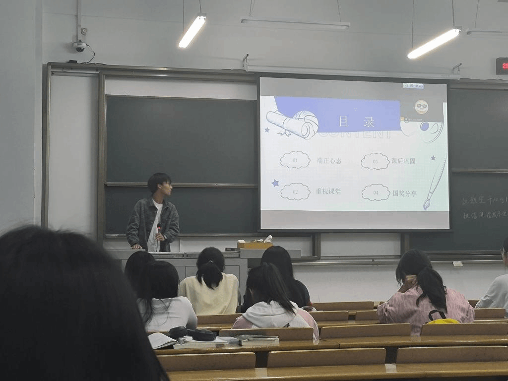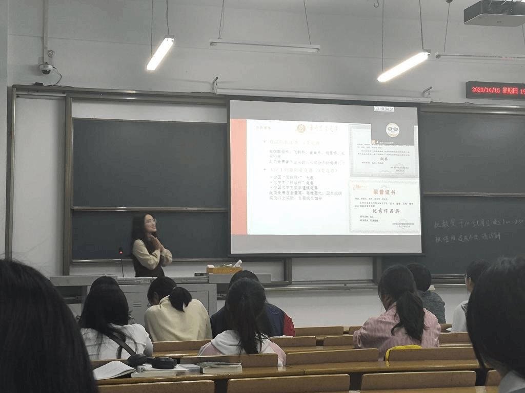 21级学生代表周怡同学针对比赛方面的问题为在场同学们做出细致剖析,她详细列举了同学们可以参加的比赛,为同学们开创了一片新的天地,接着她就“如何打好团队赛、个人赛”做了详细的解释,为在场的同学们提供了新的思想,新的路线。最后周怡同学说:你的大学,本该熠熠生辉。她鼓励同学们去做自己感兴趣的事情,去做对自己来说有意义的事情,不管这件事在别人眼里是否同样有意义。