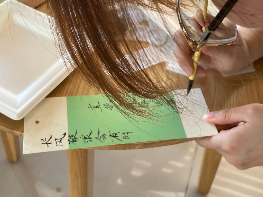 在等待蓝晒作品晾晒的过程中,同学们开始利用空白书签进行创作。他们一笔一划地认真书写自己的愿望,如“长风破浪会有时,直挂云帆济沧海”、“成功上岸梦校”等等。这些充满希望的寄语,既体现了同学们对未来的美好期待,也展示了他们的艺术才华。