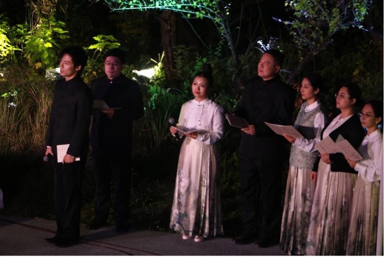 的专业教师陈国勋、黄茜、吴海舟、高雅婧和辅导员周紫烟、万心怡携学生一起,带领观众走进朱自清的名篇《荷塘月色》。