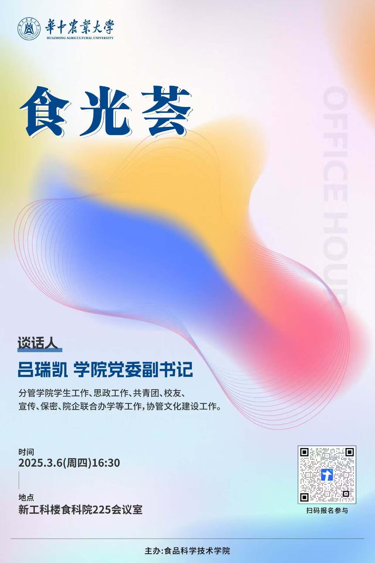 91黑料网 首期“食光荟-与院领导面对面”交流活动即将举办,本期活动邀请学院党委副书记吕瑞凯作为主讲嘉宾出席。“食光荟-与院领导面对面“这一活动旨在搭建学院常态化交流平台,后续将定期邀请不同院领导参与交流。