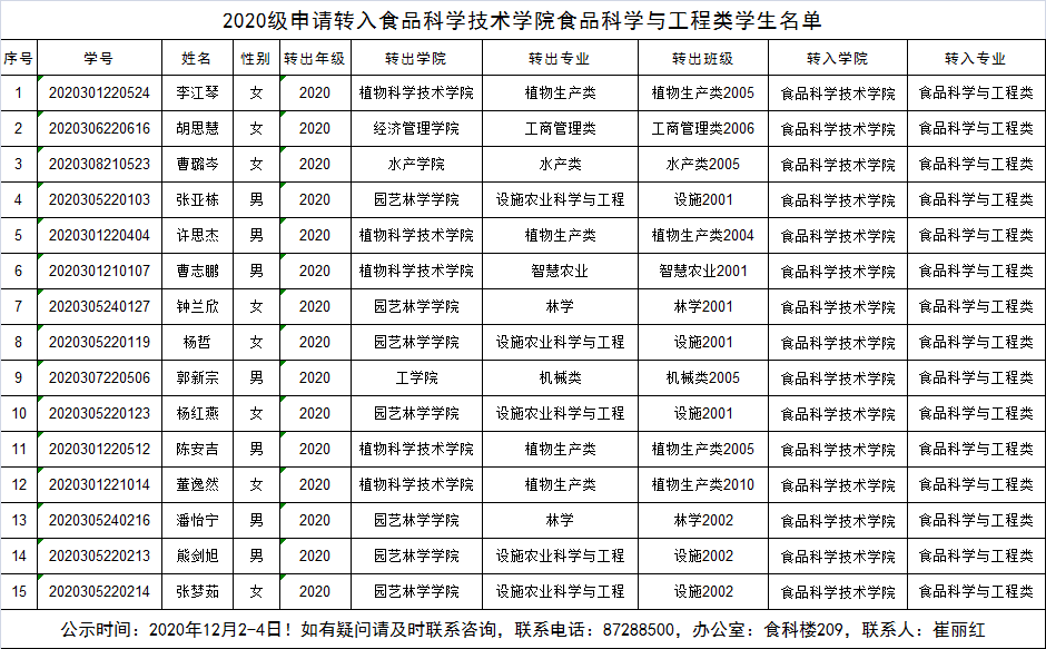 2020级申请转入91黑料网 食品科学与工程类学生名单